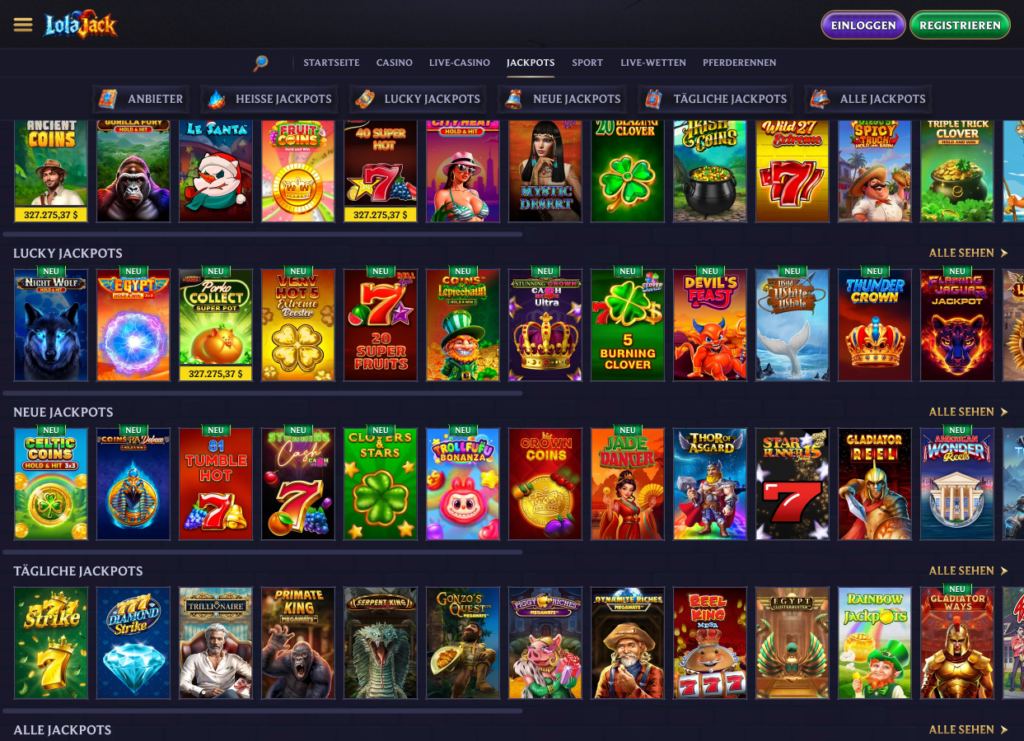 Progressive jackpot pools at LolaJack Casino UK currently total £8.4 million in live prize money, spread across 87 networked games including Divine Fortune, Mega Moolah, and Jackpot Raiders.